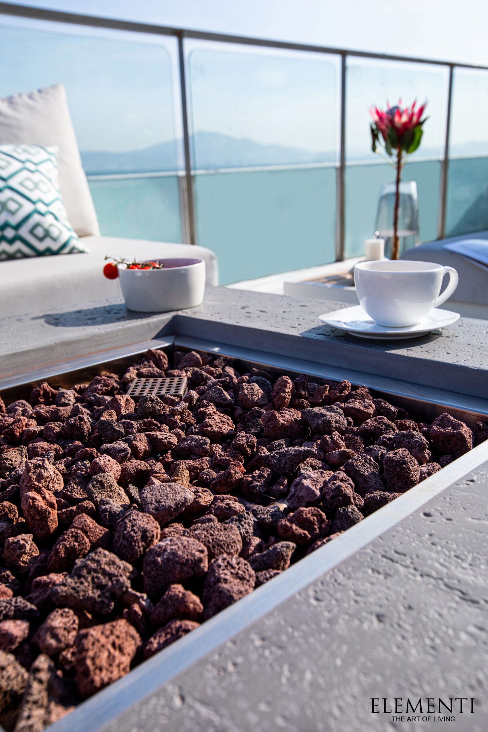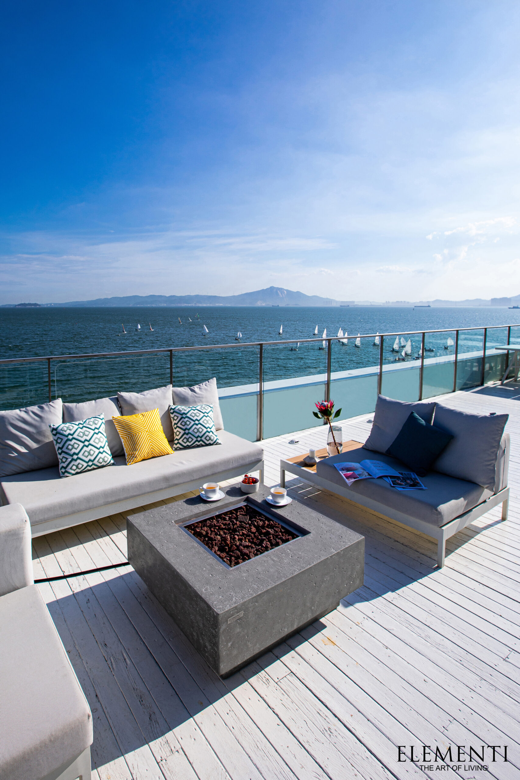 Clean, geometric lines surround a square lava rock fire pit in Elementi’s “Manhattan” fire table. We love contemporary minimalistic center pieces and this one steals the show. There’s nothing like a late night conversation around the fire, and this is your ticket.  Outdoor living is the new lifestyle choice and one of our exclusive range of gas-powered ‘fire pits’ will allow you to make more use, in greater comfort, of your outdoor space. A new concept in patio heaters, designed in the USA to enhance the outdoor spaces in your home or garden with a uniquely designed piece of garden furniture that serves a practical purpose. Our outdoor gas fire pit table are designed to complement a wide range of styles from contemporary to rustic and they will add to the appearance of any landscape, plus they provide warmth and the special visual attraction of ‘living’ flames. Although substantial, these patio heaters (square fire pit table) are portable and can be moved to alternative locations/positions with relative ease. Combining warmth and ambiance, our deck fire pit table will bring friends and family together to spend hours of quality time. Sit back and relax with this gas fire table centered in the middle of your backyard, patio, deck, or poolside.